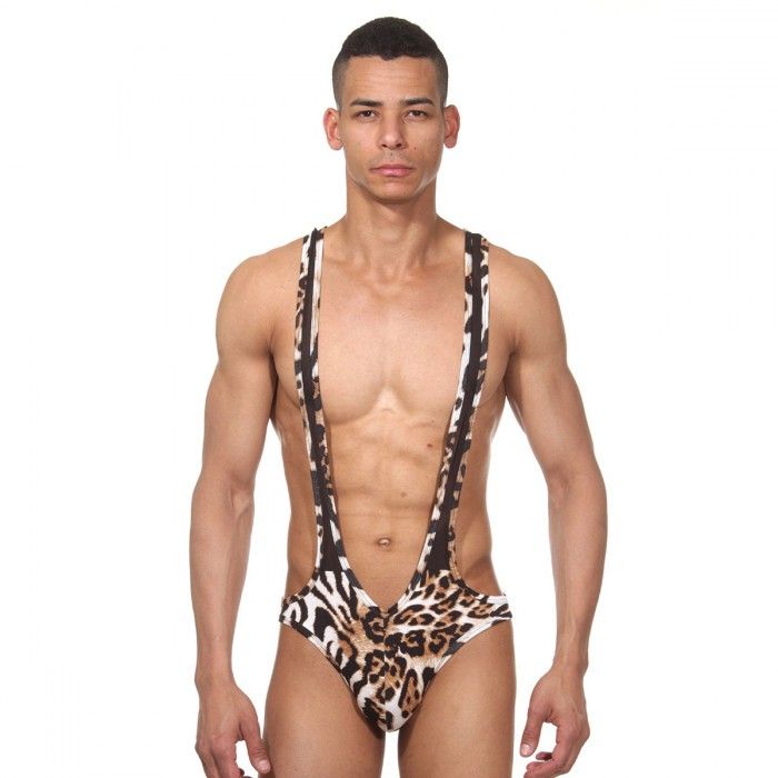 Боди для мужчин, в котором скомбинированы два типа ткани: мягкая, гладкая леопардовая и полупрозрачная черная сзади на ягодицах. Широкие отстроченные лямки соединяются с трусами-слипами.
