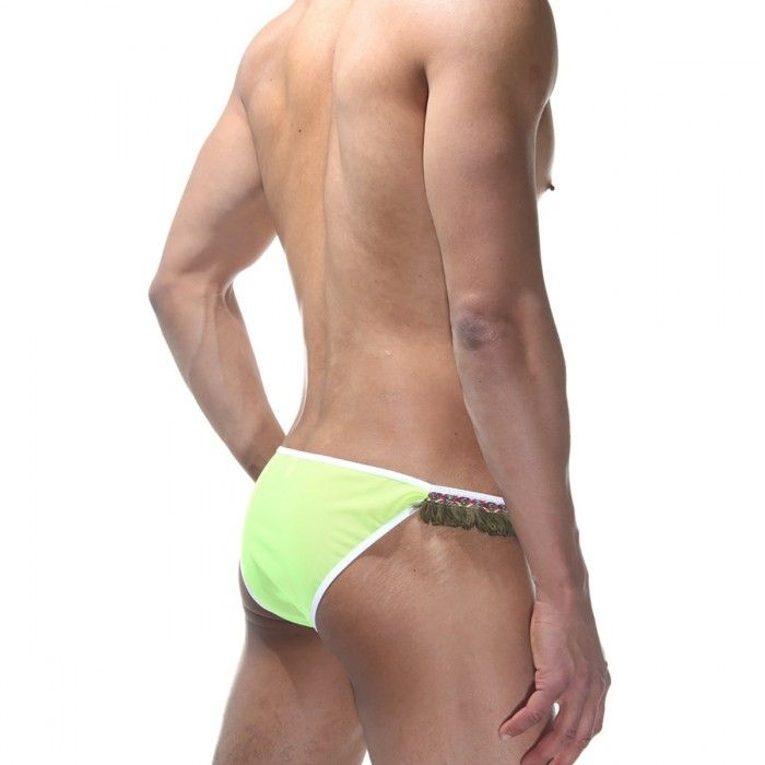 Танга для мужчин сочного ярко-зеленого цвета. Трусы на тонкой белой резинке, по бокам которой пришита темно-зеленая бахрома.