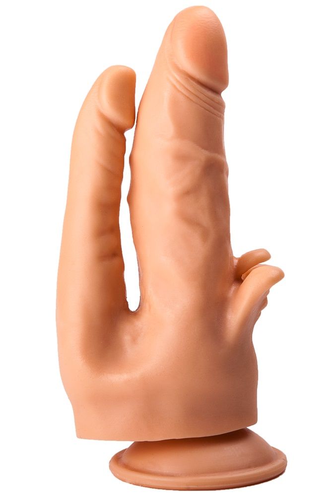 Получить наслаждение 2-в-1 проще, чем может показаться. Эта бежевая секс-игрушка из бархатистого на ощупь материала представляет собой два сросшихся в основании фаллоса. Тоненький ствол с чуть вытянутой головкой идеально подходит для анальной стимуляции. Крупный, с пышными венами и мягкими лепестками для клиторального массажа, подарит самые чувственные проникновения в лоно. Одновременная стимуляция внутри и снаружи – гарант действительно сильных ощущений и мощного оргазма. Подошва-присоска облегчит пользование реалистичным стимулятором. Диаметр анального отростка – 2,1 см.